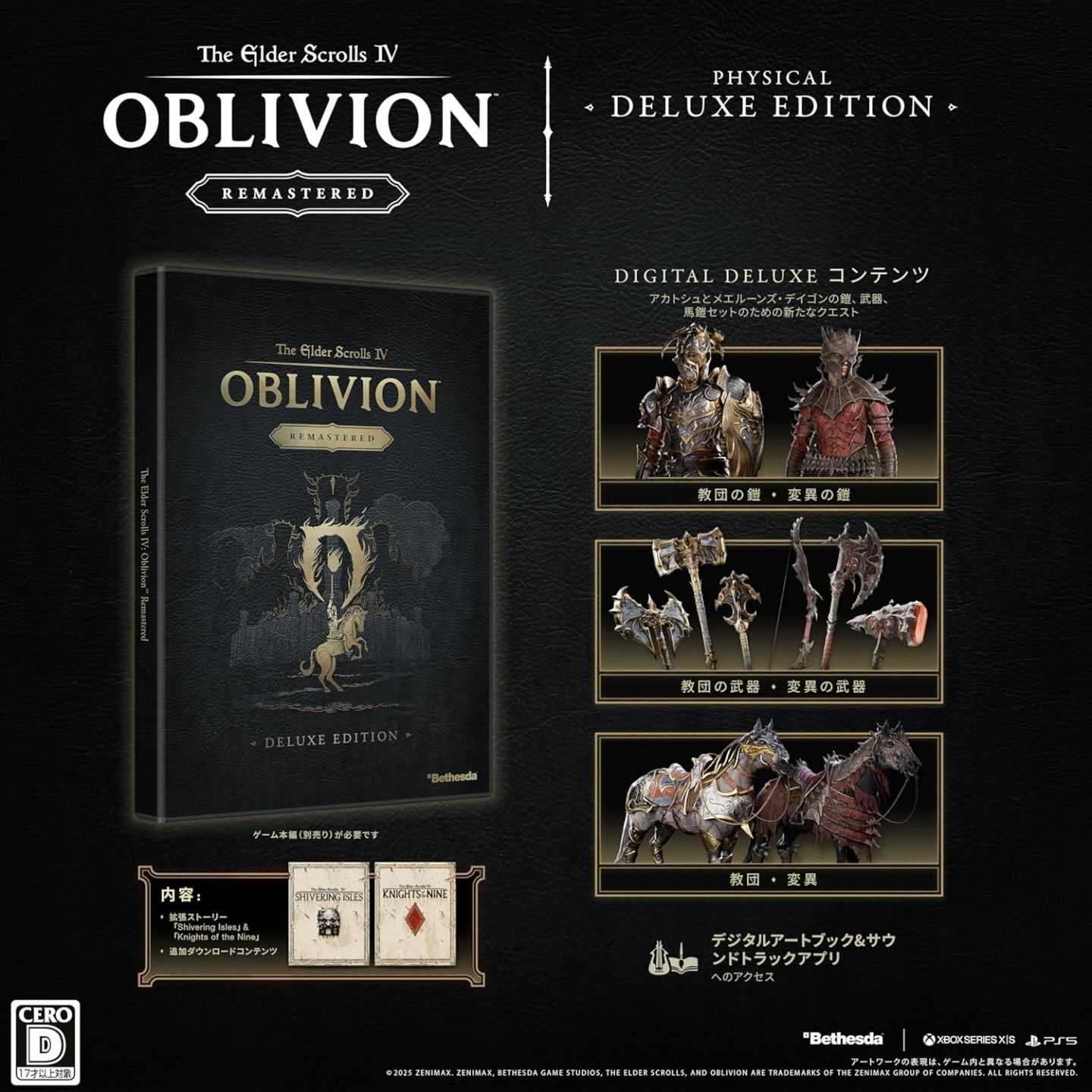This deluxe edition includes the full base game plus all major expansions and DLC — namely Knights of the Nine, Shivering Isles, and additional mission and content packs — along with exclusive digital content such as a special Akatosh & Mehrunes Dagon armour/weapons/horse-armour set, a digital art book, and the full game soundtrack.
