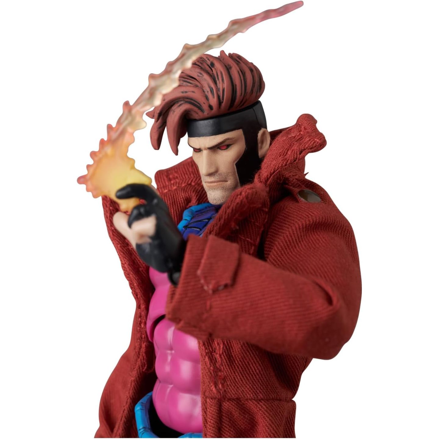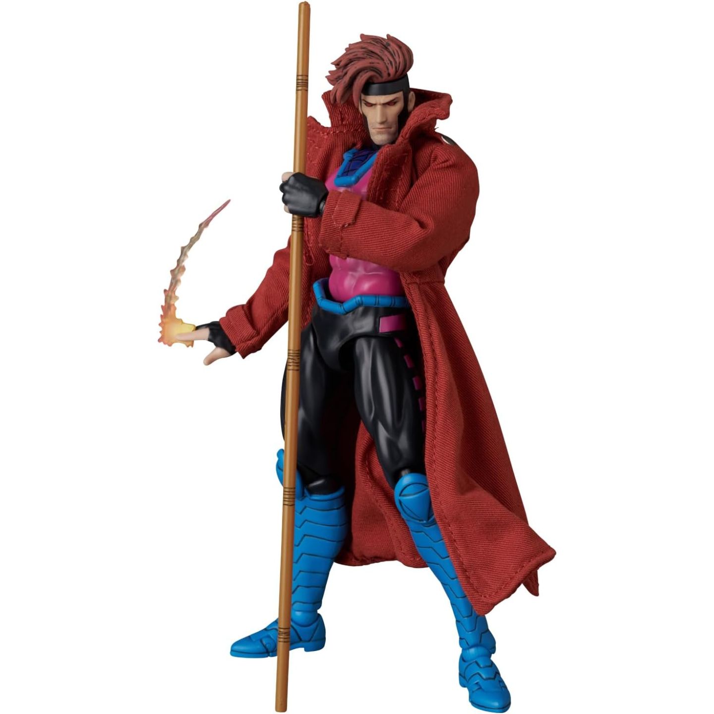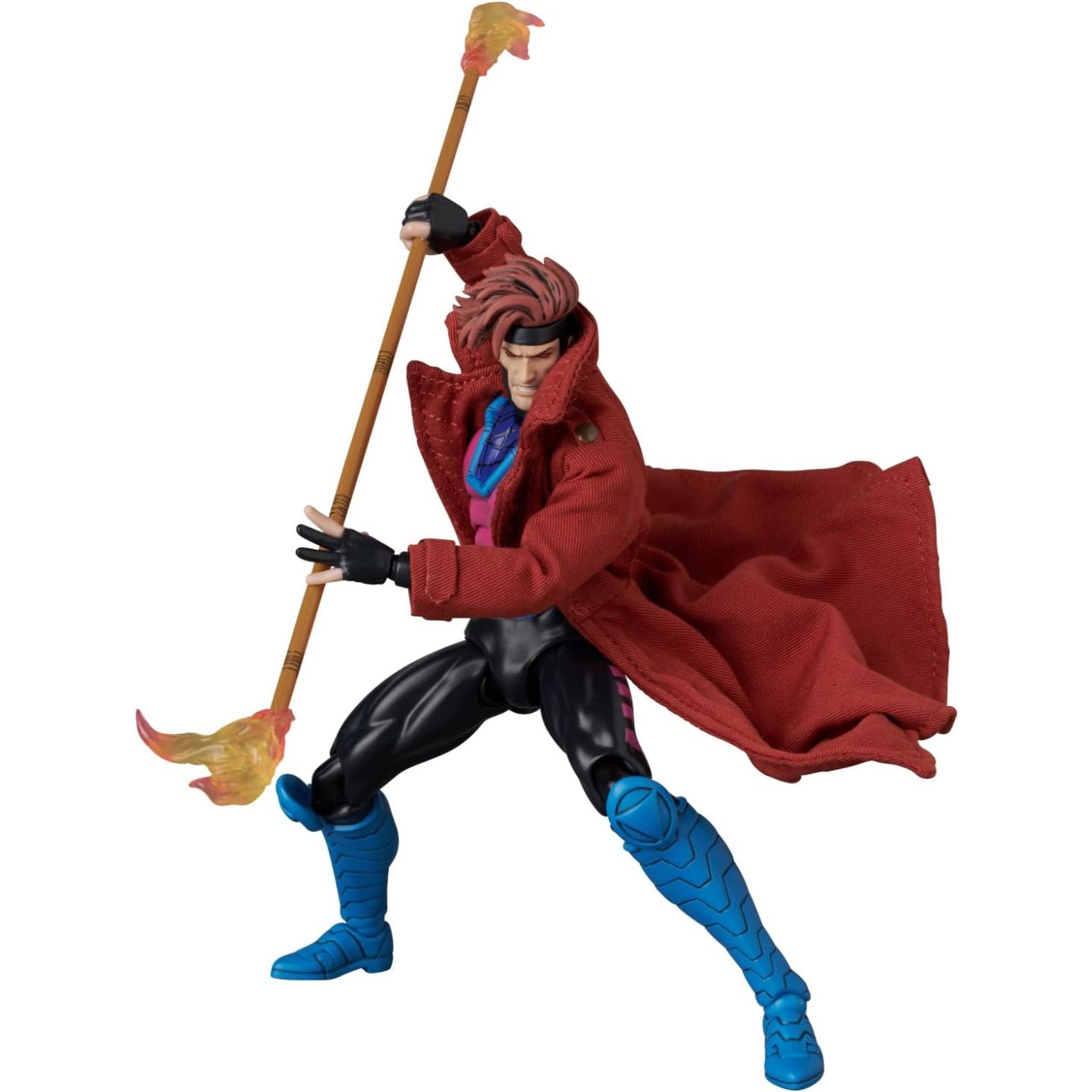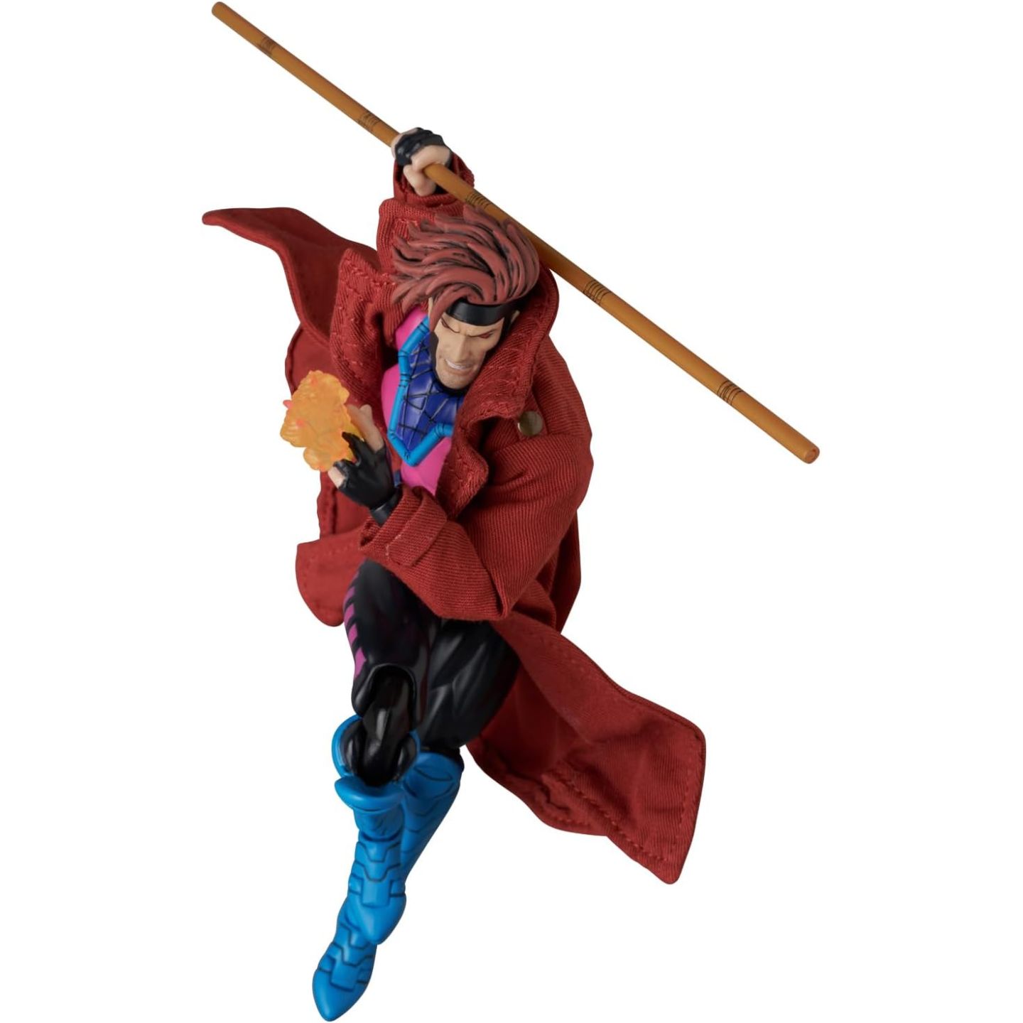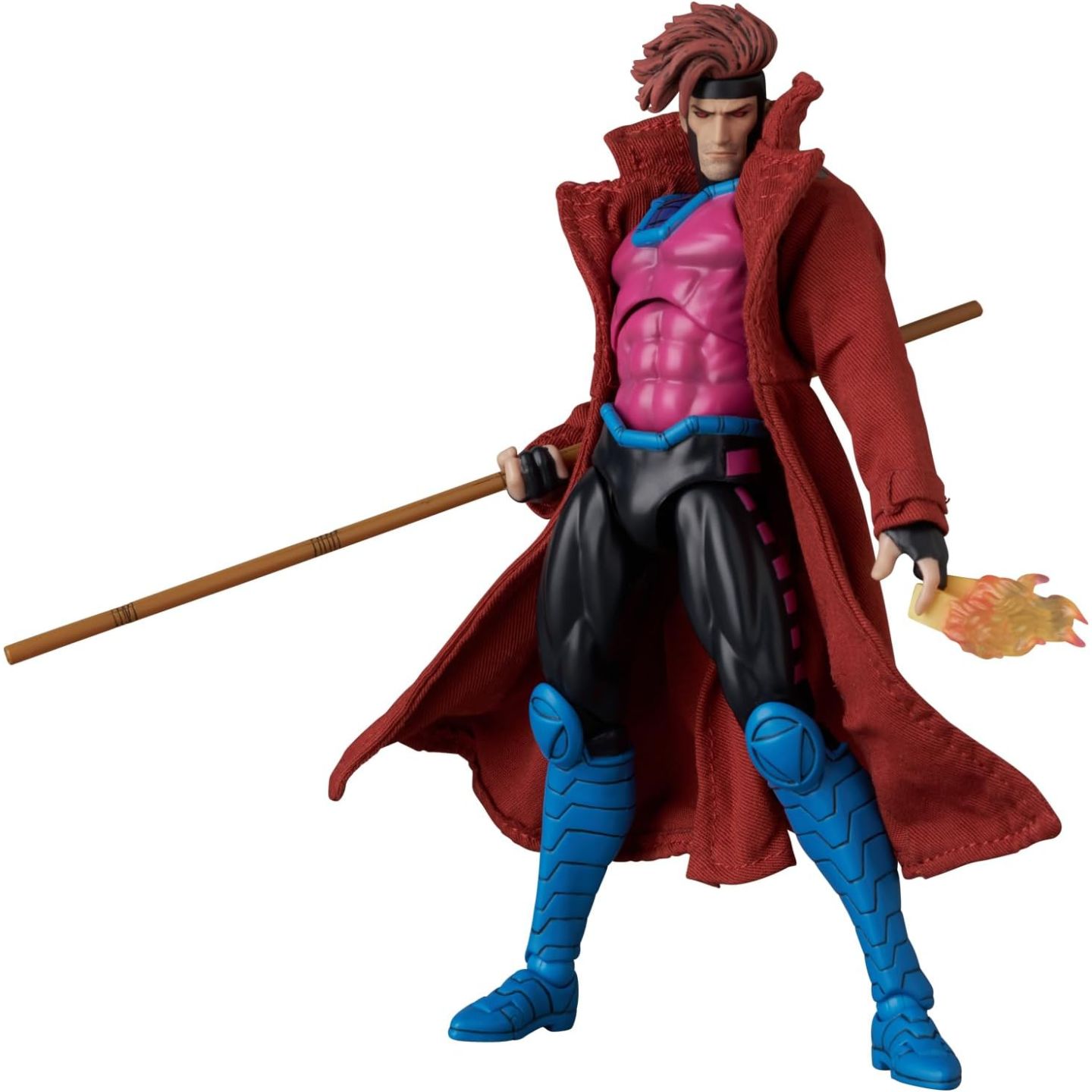 R: Il Gambit MAFEX (variante fumetto) è dotato di un bastone bo, di effetti carta da lancio e di mani intercambiabili per diverse pose d'azione.